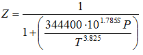where ρ is the density in g/cm3, P is the pressure in psig, MW is the molecular weight (lb/lbmol), R is the gas constant (10.731 ft3 psi °R−1 lb-mol−1), T is the absolute temperature (°R) and Z is the compressibility factor.